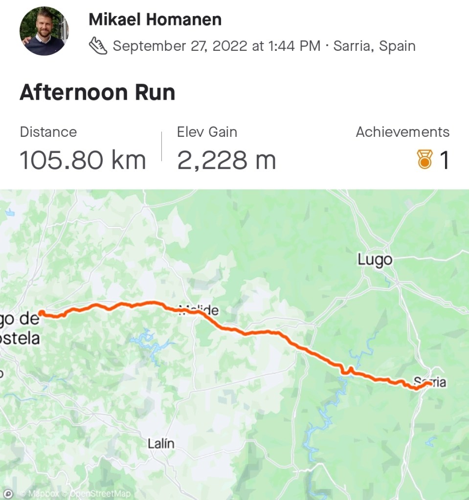 How did I adapt? I went all full Buddha on this challenge, meditated a lot, did yoga with Adriene (dont get excited, I mean the youtube yoga channel), closed nearly all social media (e.g. whatsapp) and then left for Spain (I originally wanted to and almost got to go on a 8 day sailing trip, but thats another story). Overall, it was clear that the only way to stop the engine was by focused mindfullness which could be achieved by meditation, nature or by spending time with people close to me. Luckily, I got a mix of these. I ended up on the Camino de Santiago pilgrimage and running 105km with a friend. We began the journey in Sarria, talked, walked and ran throughout the night for 31 hours. There were a few interesting moments worth mentioning. For example, because my friend had a few sleepless months prior to the run, he took two 20 min naps along the route as he was about to pass out on several occasions due to sleep deprivation. Plus, he started hallucinating every now and then. I timed the naps and then woke him up. It rained during the night and it was pretty cold as well, so we had to keep moving. He also lost consciousness at a gas station at 7am, but luckily I was there to catch him before he fell on the floor (and I thought I was the one that needed help with mental challenges). Good thing the station had plenty of cookies to sugar him up. We then booked a hotel for a 3 hour nap and continued running (the hotel staff were pretty confused as we gave the keys back already at 1pm – they understandably assumed we’d stay the night). Others got good laughs before when they asked “where are you staying the night?” to which we answer “oh, we’ll just continue running”. To end, we run, walk and chat for another 12 hrs and then on the 31st hour, just 12km away from Santiago de Compostela, my friend’s ankle was done. There was nothing to fix it, and we wanted to be sure we wouldn’t cause any long term damage, so we took a taxi to the city and end the pilgrimage with drinks and laughs.