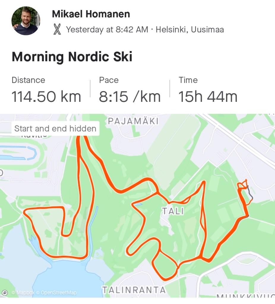 After enjoying good chats with fellow skiers, listening to a few audible books, the next day at 6am, 22 hours later, 114km of “classic” style off-track skiing I said to myself “Dear Weather, You Win. I am done”. I head home, eat pizza and collapse.